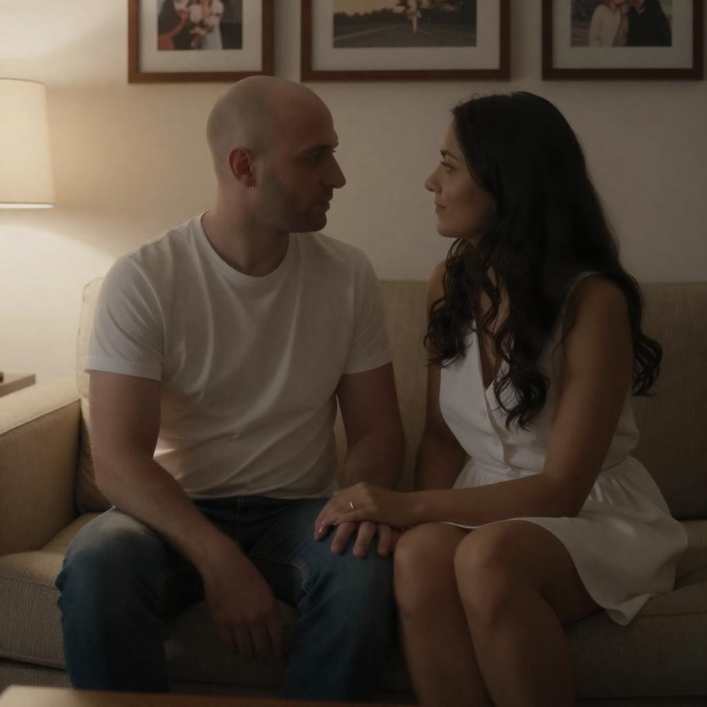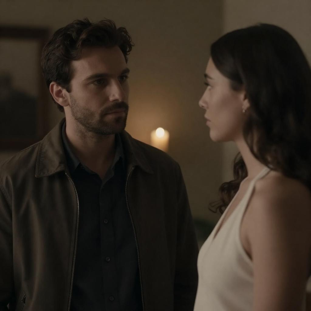 Photograph of an outdoor night scene with three people. An older bald man with a gray beard, wearing a long gray coat, leans over a bench. Two women sit on the bench; the left woman wears a white off-shoulder dress, and the right woman wears a black dress. String lights hang in the background, illuminating the dark foliage.