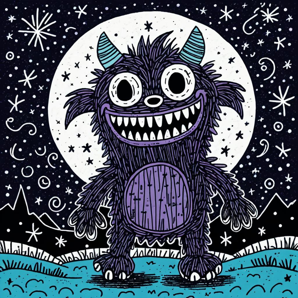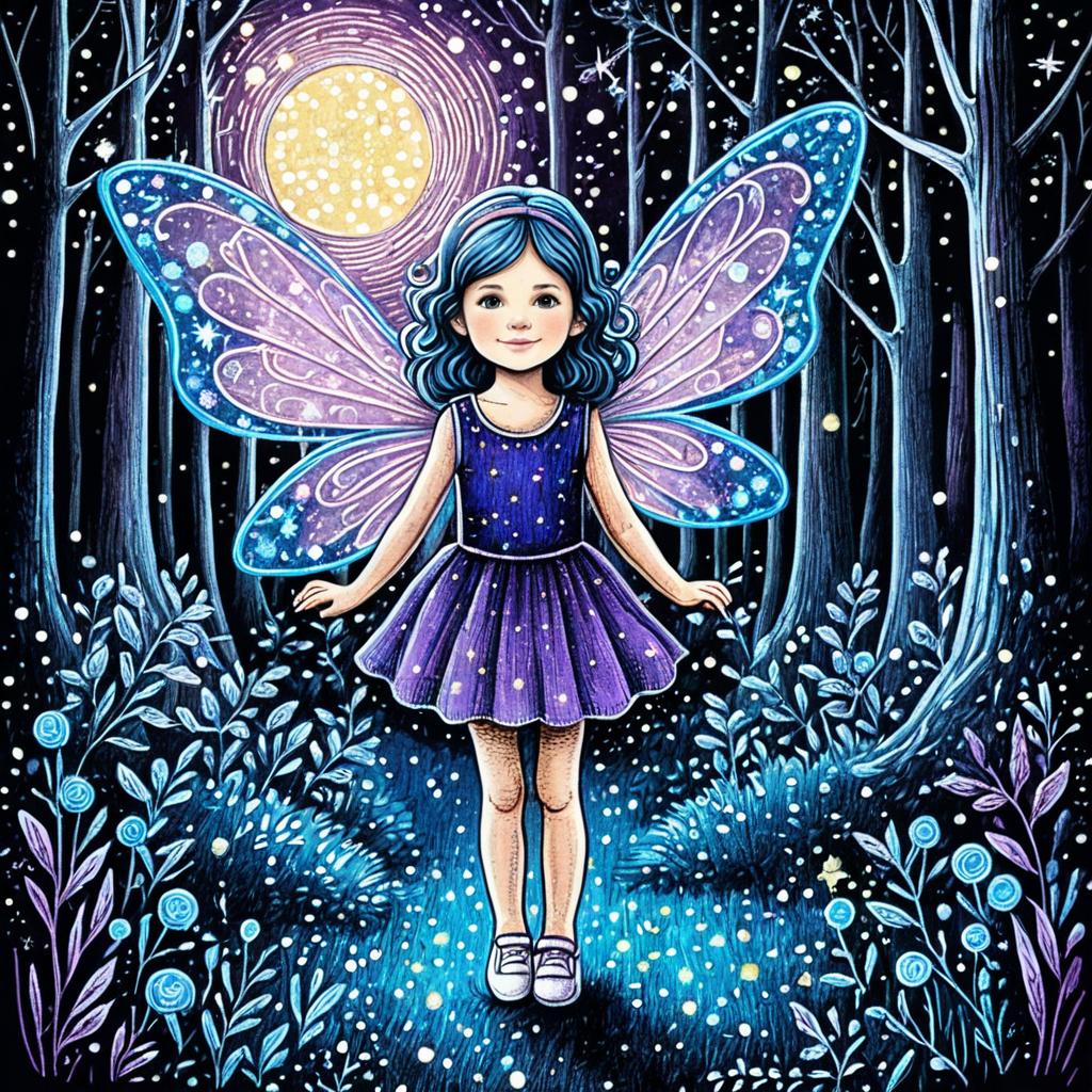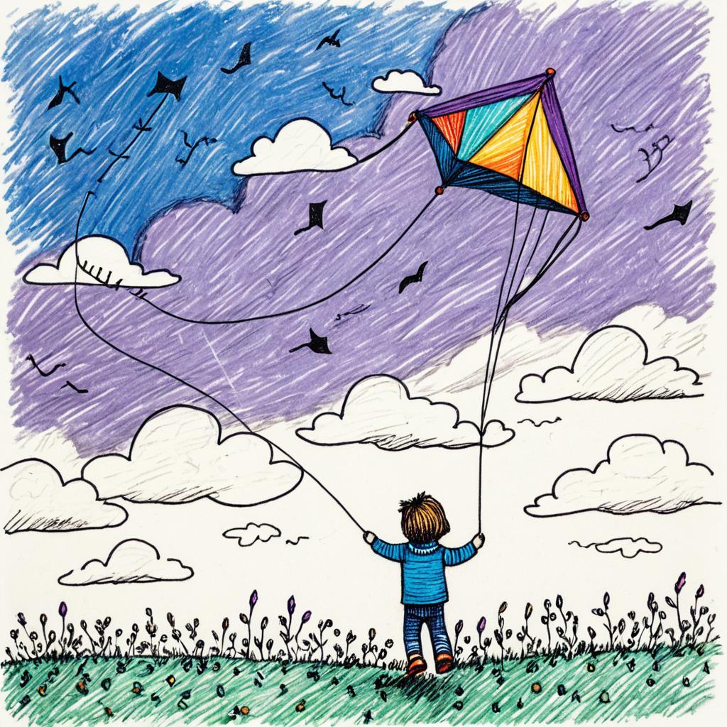 (child's drawing:1.4) of a flying kite, crayon drawing, windy afternoon with colorful clouds, purple and blue