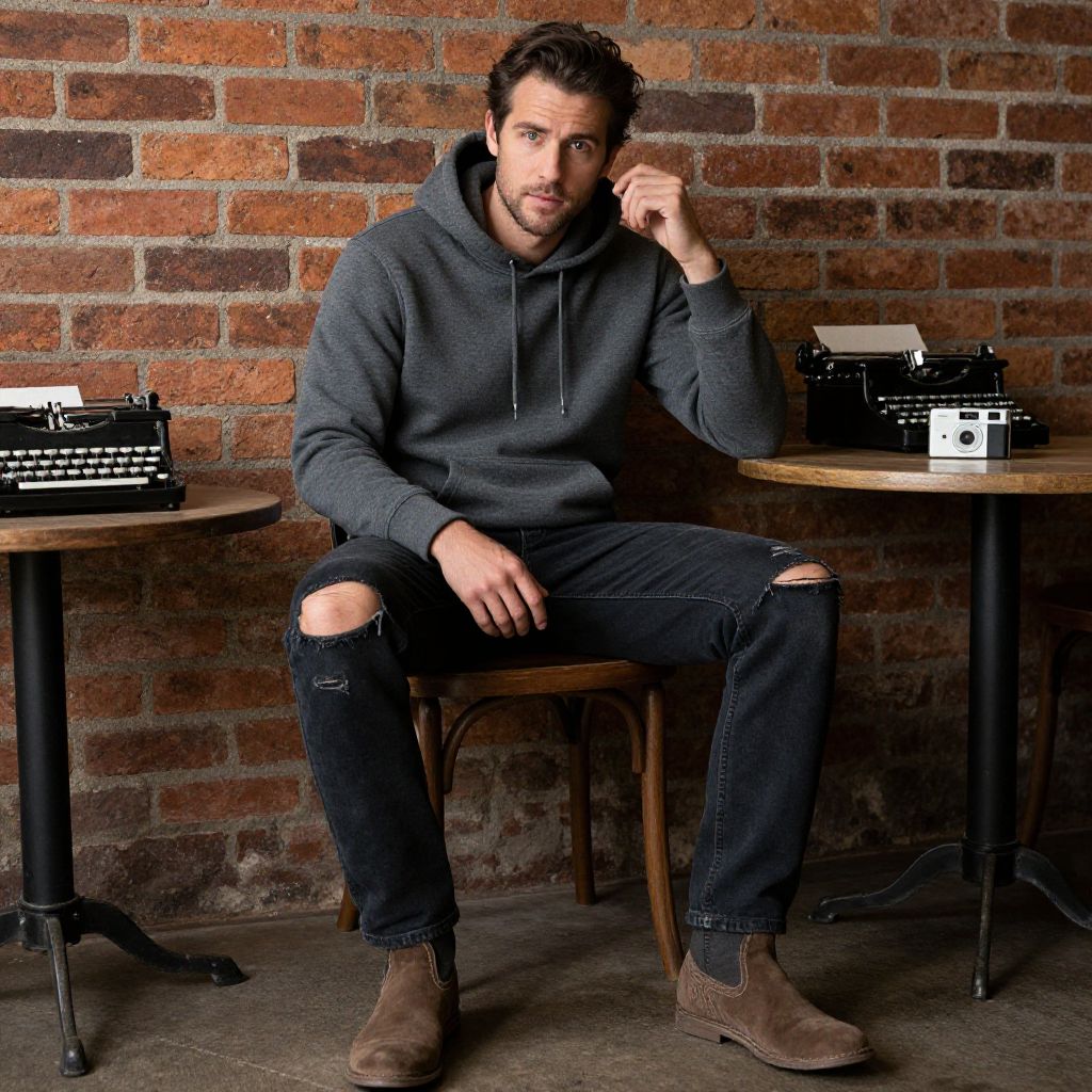 A man, charcoal gray fleece hoodie, distressed black jeans, brown suede chukka boots, subtle western stitching, relaxed fit, historic brick building, vintage typewriters, cozy coffee corner, disposable camera style, thoughtful expression. Man has masculine face and piercing eyes