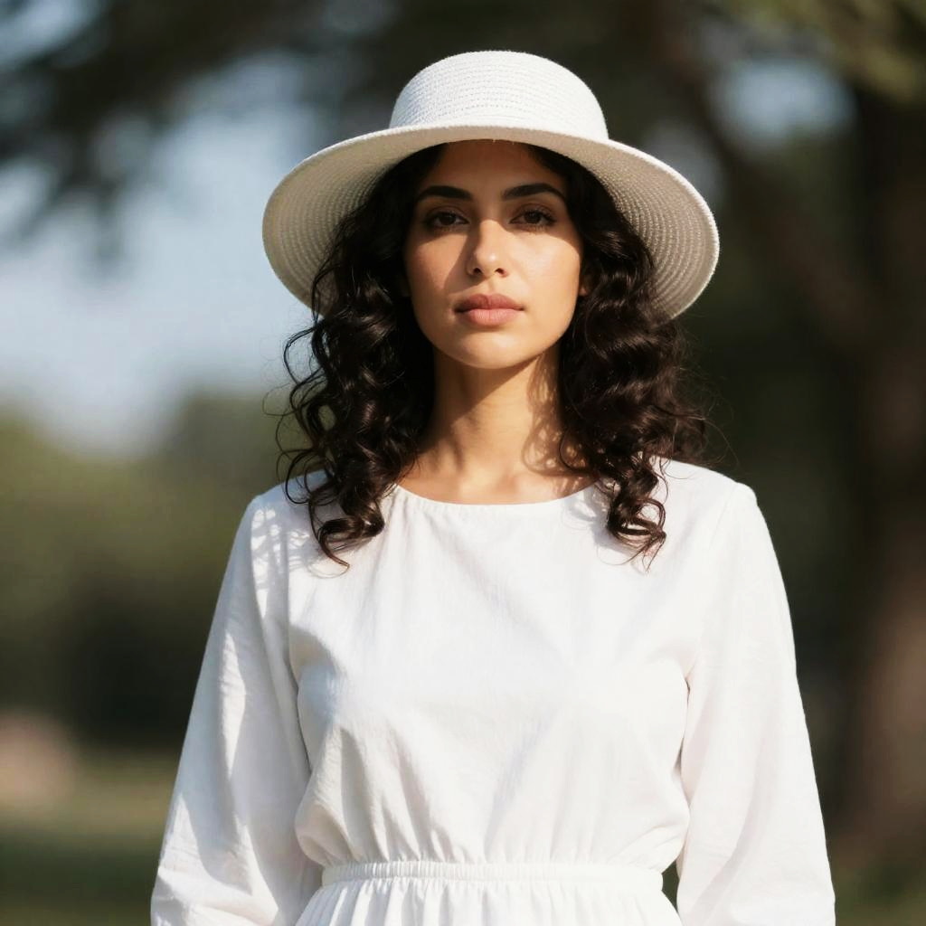 Black and white photograph of a woman with curled dark hair, wearing a large white sunhat and a white dress with a belt. She stands outdoors with blurred trees in the background. Her facial expression is neutral. She is centered in the frame.