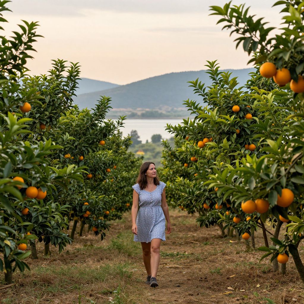 A woman strolls through a vibrant orange orchard, flanked by rows of lush trees bearing ripe fruits, under a serene sky with distant mountains and a tranquil body of water in the background.
