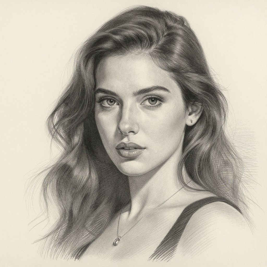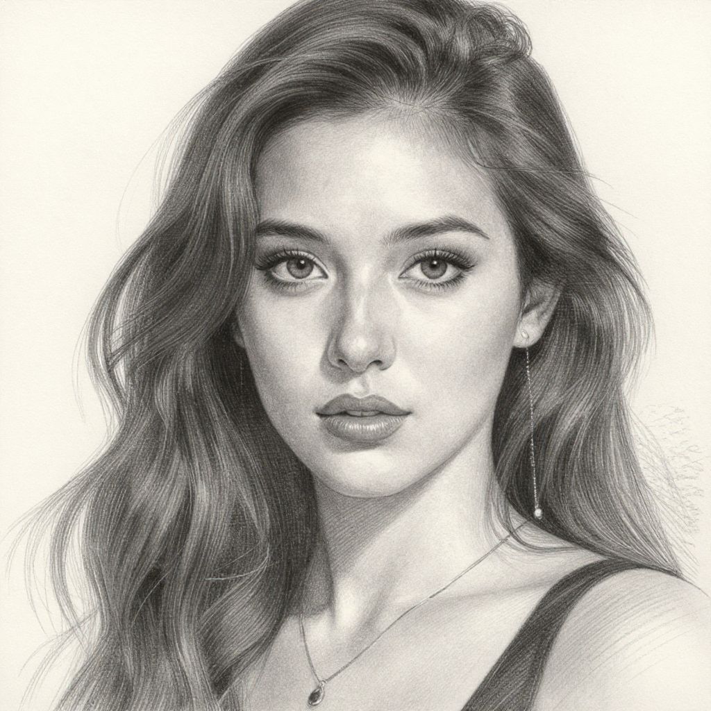 Intricate pencil strokes capture a lifelike portrait of a woman with flowing hair, piercing eyes, and subtle jewelry, showcasing the artist's mastery in realism.