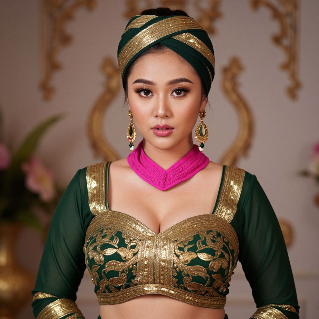 A beautiful Asian woman with big tits and a sexy vibe, wearing a stunning green and gold outfit with a vibrant pink collar, adorned with elegant earrings on her ears. She has a turban wrapped neatly around her head, adding a regal and mystical touch. Her eyes are expressive and captivating, giving off a confident, graceful aura. The setting is richly detailed, with soft lighting highlighting her features and the intricate patterns of her clothing. A blend of traditional and modern elegance, she stands with poised elegance in a luxurious, dreamy environment.