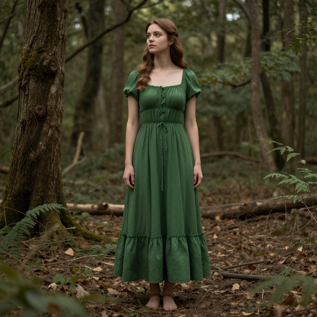 "Sleeping Beauty Forest Dress, a woman in a green dress standing in a forest"