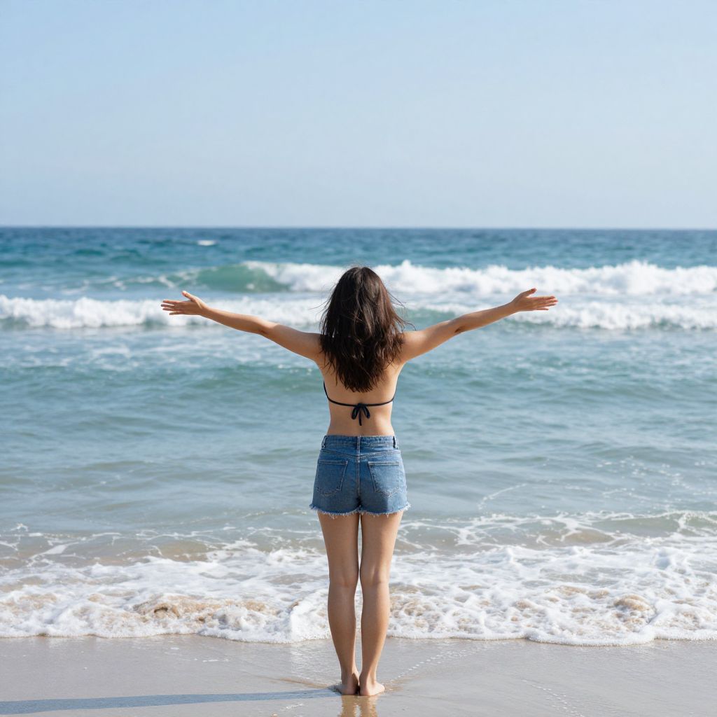 Embracing the boundless horizon, a woman stands by the beach with arms outstretched, embodying a profound sense of freedom and connection to the eternal rhythm of the ocean, where the air carries the whispers of salt and the promise of new beginnings.
