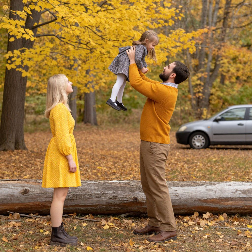 Photograph of a family in an autumn forest. A bearded man in a bright orange sweater and brown pants lifts a small girl with blonde hair, wearing a polka-dot dress and white tights, with black shoes. A blonde girl in a yellow dress and black boots stands to the left. The background features yellow-leaved trees and a fallen log. A silver car is parked to the right. Fallen leaves cover the ground, adding texture and warmth to the scene. The overall color palette is vibrant, with dominant yellows and oranges.
