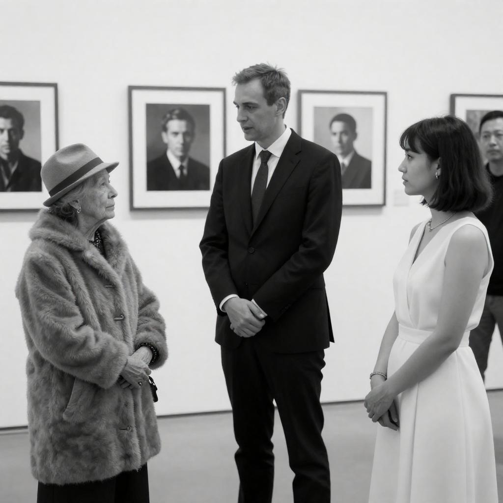 Photograph of three people in an art gallery. Elderly woman with short blonde hair, orange turtleneck, brown cardigan, gesturing to younger man in navy jacket, brown hair, standing close. Black woman with braided hair, floral kimono, observing. Gallery walls with framed artwork, glass display cases with ornaments. Young man leaning slightly, elderly woman smiling, black woman neutral expression. Modern, bright setting.