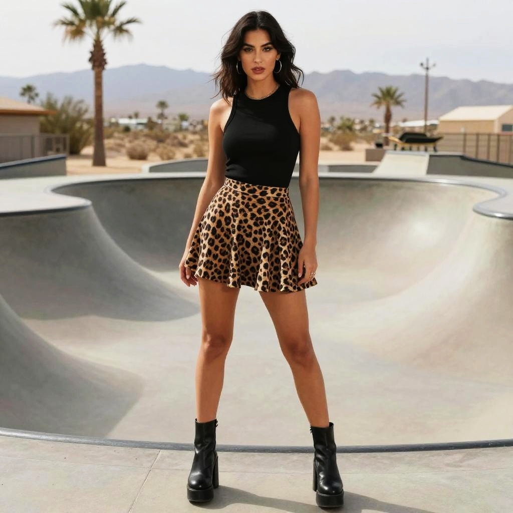 A woman in edgy street style, wearing a sleeveless black tank top and a flared leopard print mini skirt, paired with black platform ankle boots, standing at a skate park in a desert landscape, vertical inc. Sexy. Pretty face and beutiful eyes