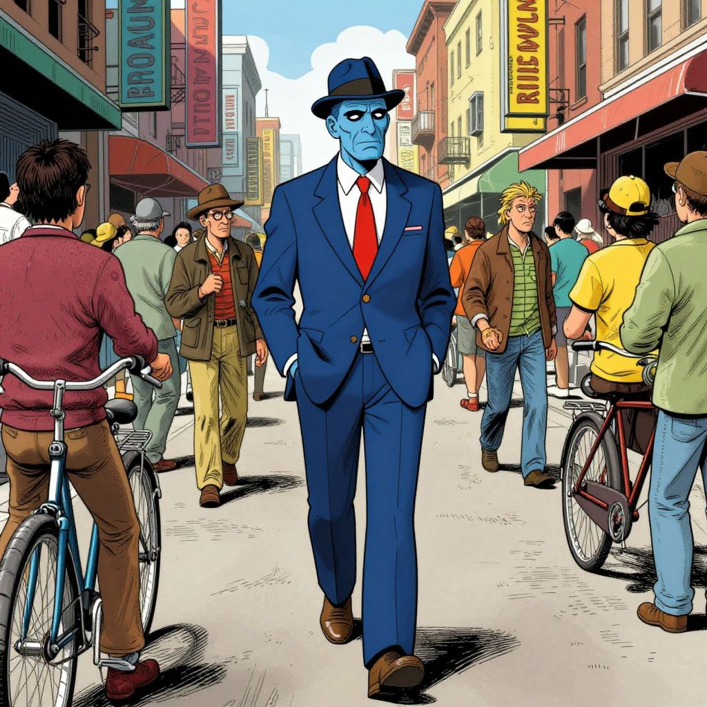 The image depicts a bustling street scene in a vibrant, urban environment, reminiscent of Robert Crumb's distinctive style. The central figure, a blue-skinned man, exudes a sense of confidence and coolness as he strides down the street, his hands in his pockets and a determined expression on his face. He is dressed in a sharp blue suit, complete with a matching hat and a red tie, adding to his dapper appearance. The surrounding crowd, dressed in a mix of casual and slightly out-of-place attire, appears to be going about their day, with some individuals carrying bicycles. The street itself is lined with buildings featuring colorful signs and awnings, creating a lively and dynamic atmosphere. The overall composition is rich with detail, from the textures of the clothing and buildings to the intricate patterns on the man's gloves. The interplay of colors and shapes creates a visually engaging scene that captures the essence of a busy city street.