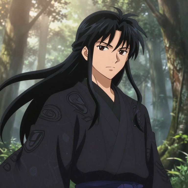 Anime-style digital drawing of a serious-looking man with long black hair, wearing a black kimono with intricate patterns, standing in a misty forest.