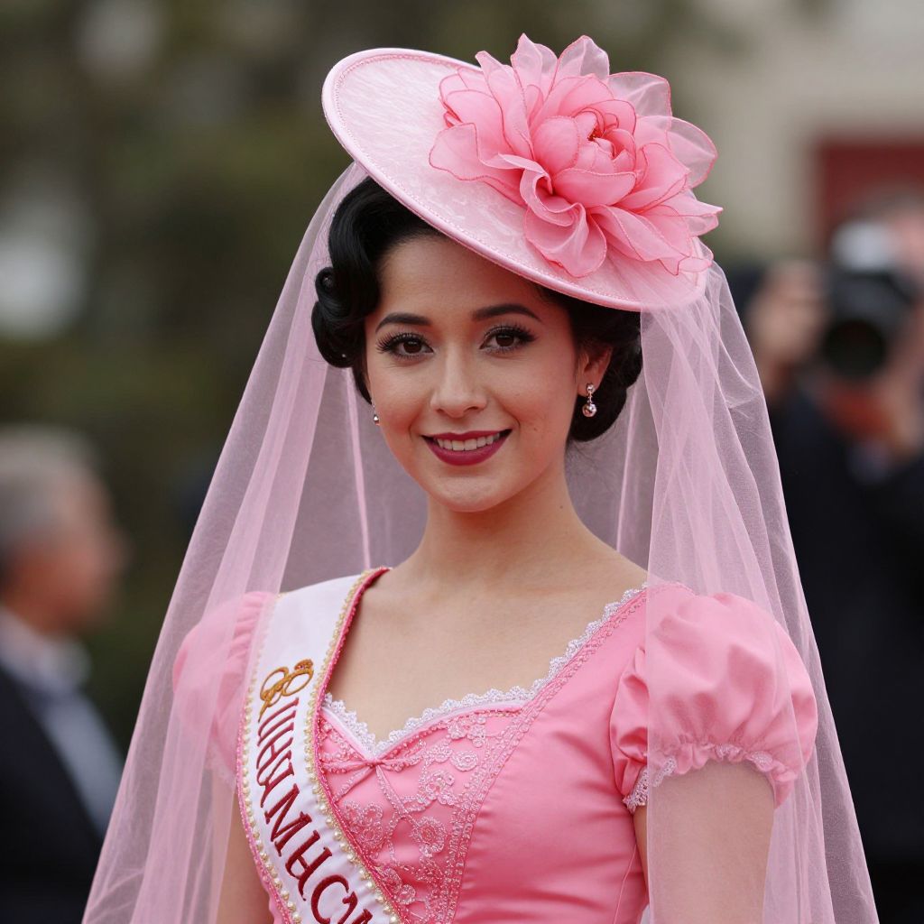 Photograph of an Asian woman in a pink dress and veil, adorned with a large pink flower hat, smiling at a beauty pageant. Blurred