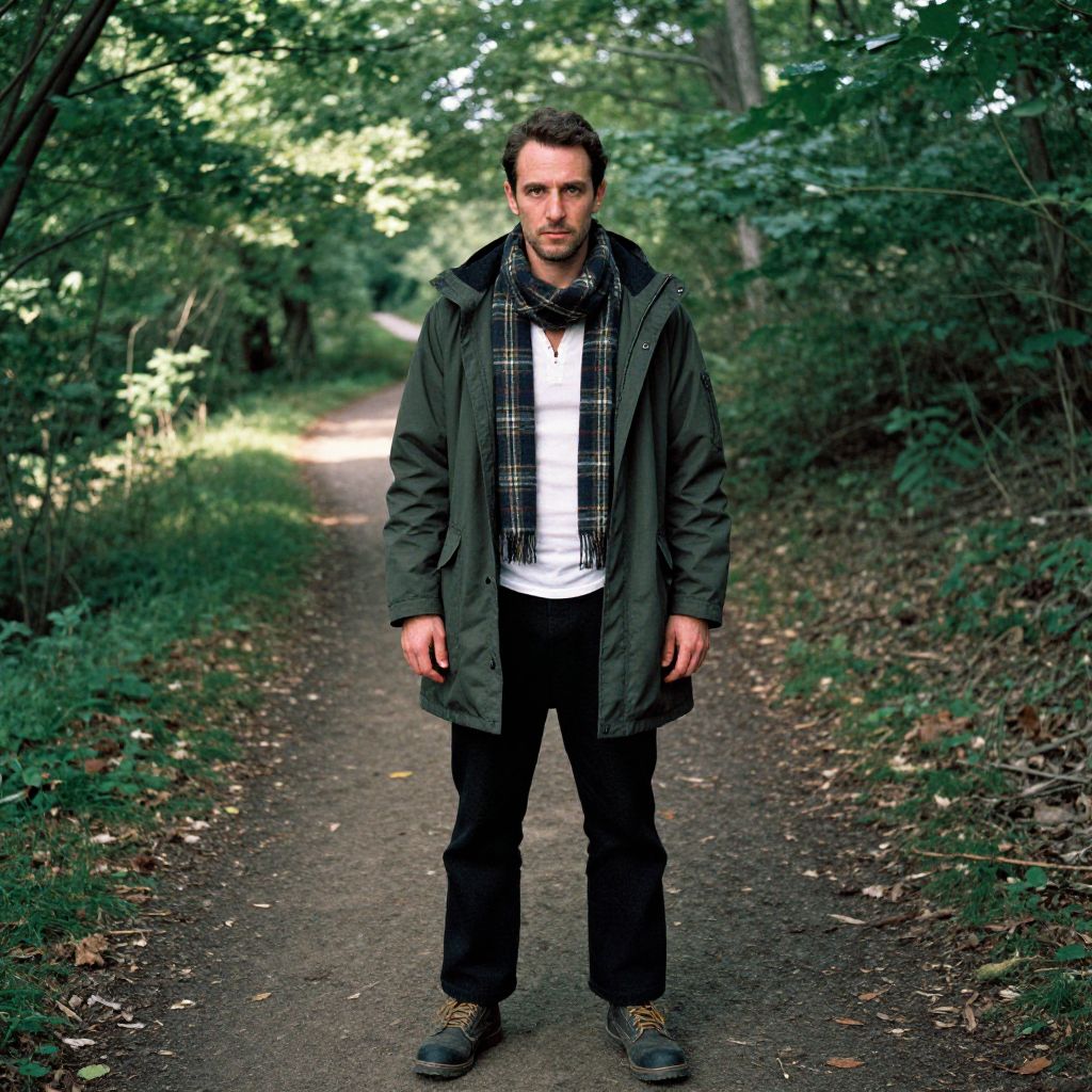 A man, dark green parka, plaid flannel scarf, straight-leg black trousers, fitted white henley shirt, rugged lace-up boots, lush green canopy, winding dirt path, sun-dappled forest floor, instant film style, contemplative expression Man has masculine face and piercing eyes