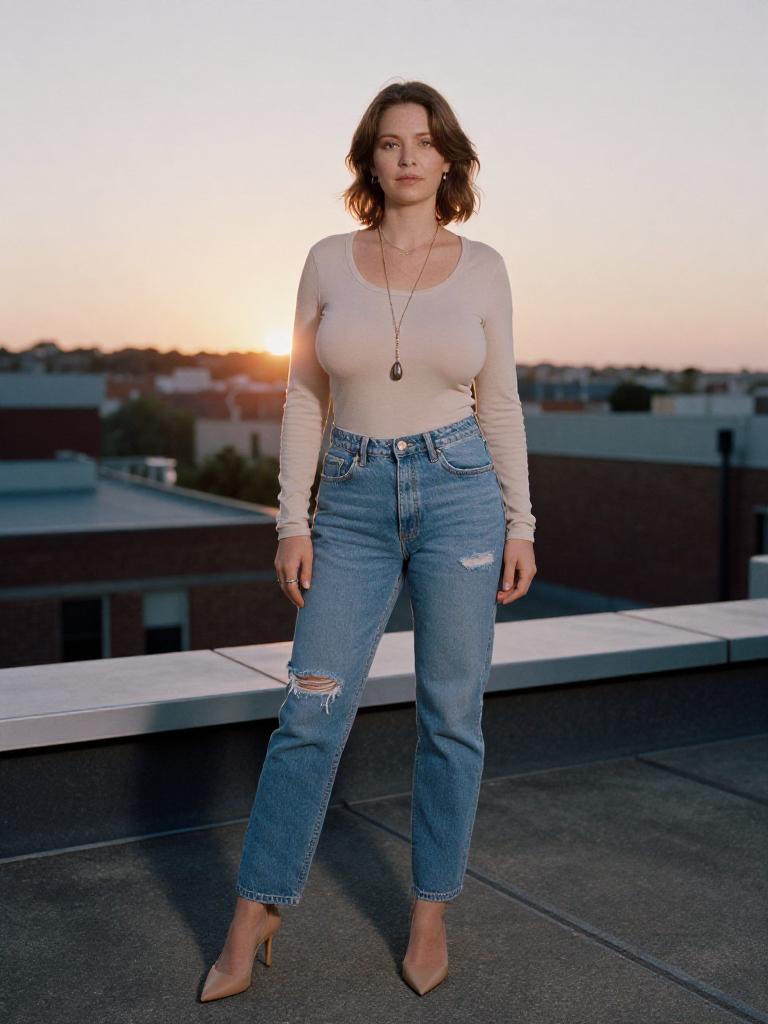 A svelte woman in a light beige long-sleeve top and distressed blue jeans, tan pointed-toe heels, and a long pendant necklace, captured in the warm tones of Eastman LLP film stock, standing at a rooftop with a stunning sunset view. Sexy. Pretty face and beаutiful eyes. Big breasts