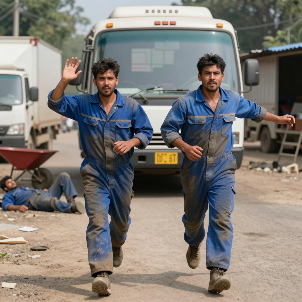 Two men working on a steel bridge. Man on left has dark skin, short hair, wears a light blue shirt, looks down. Man on right has lighter skin, receding hair, wears a white tank top, has a sun tattoo on his arm, looks down. Both have dirty arms, wearing gloves. Background shows steel beams and structure.