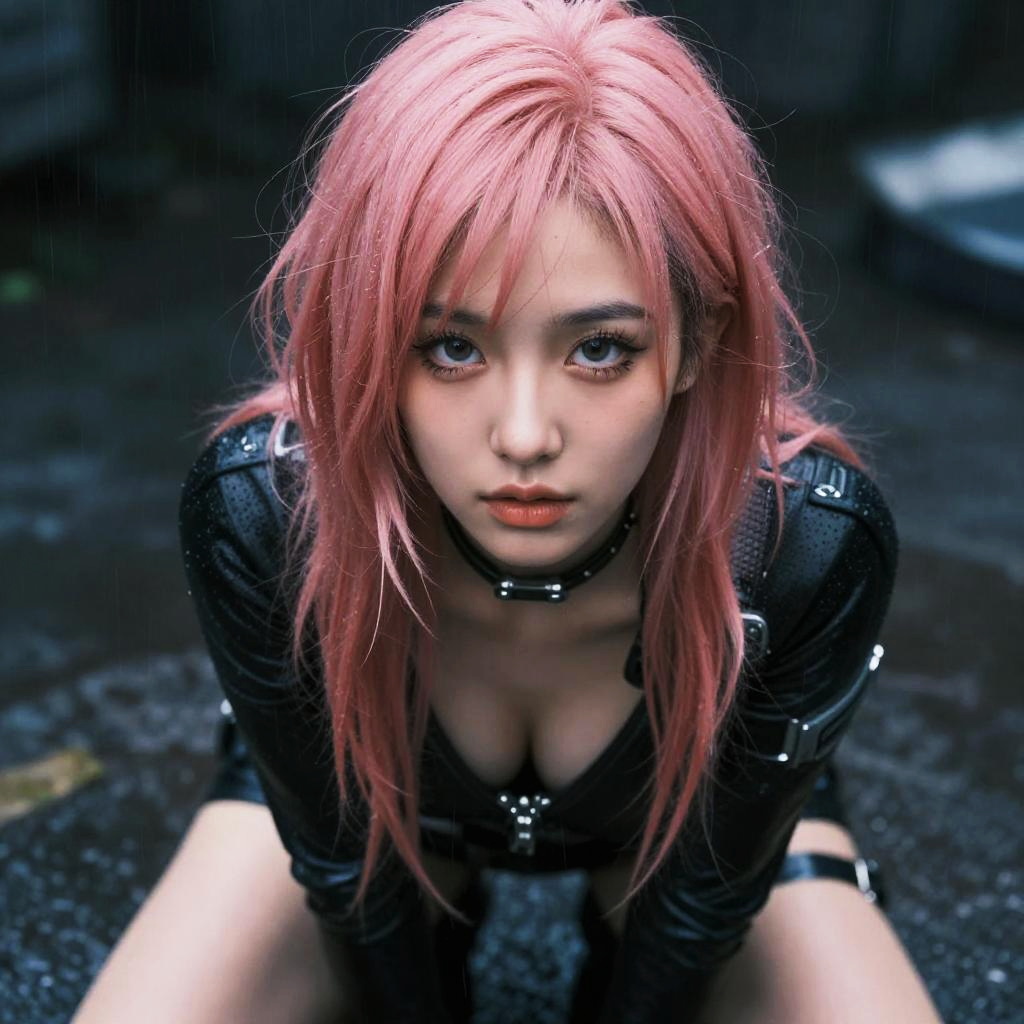 High quality fingers, normal hands, detailed fingers, masterpiece, (realistic, photo-realistic:1.37), (22 years old woman), medium breast, small waist, pink hair, green eyes, beautiful face, perfect illumination, beautiful detailed eyes, looking at viewer, stunningly beautiful woman, detailed hairstyle, detailed background, open sport bra, shorts, in city, (sweat:1)
