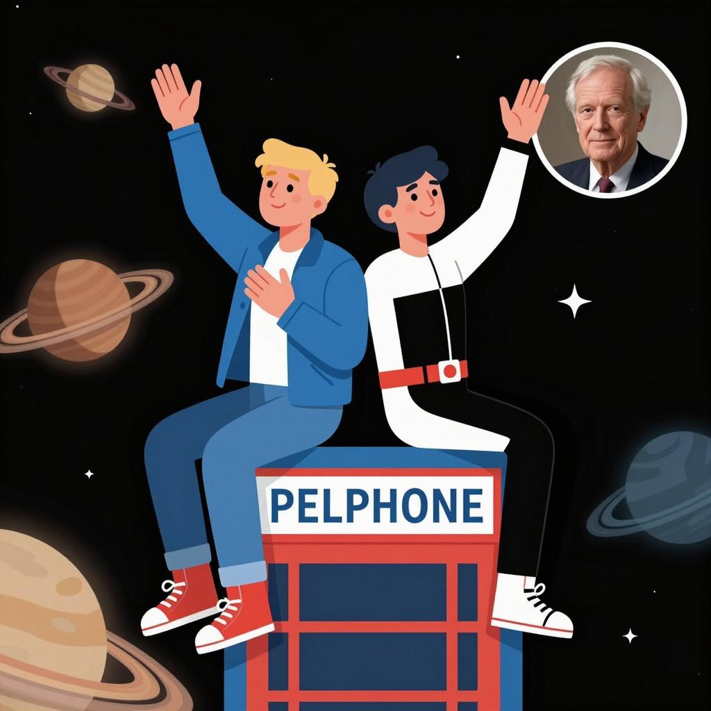Illustration of two men sitting on a blue and red "TELEPHONE" sign in outer space. The man on the left has blond hair, wears a blue jacket and jeans, and raises both arms. The man on the right has dark hair, wears a black and white outfit with a red belt, and smiles while raising his right arm. A circular portrait of an older man floats in the background. Planets and stars are visible in the dark sky. The man on the left has his left hand on his chest. Both men wear red and white sneakers. A planet with rings is in the bottom left corner.