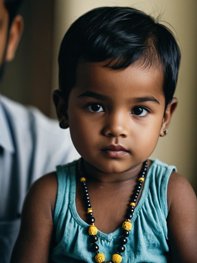 Close-up portrait of a young Indian boy with dark skin and short black hair wearing a sleeveless blue shirt and a decorative necklace with black and yellow beads. The child has a calm expression with closed lips and is looking directly at the camera. The background is softly blurred, emphasizing the child's face and jewelry.