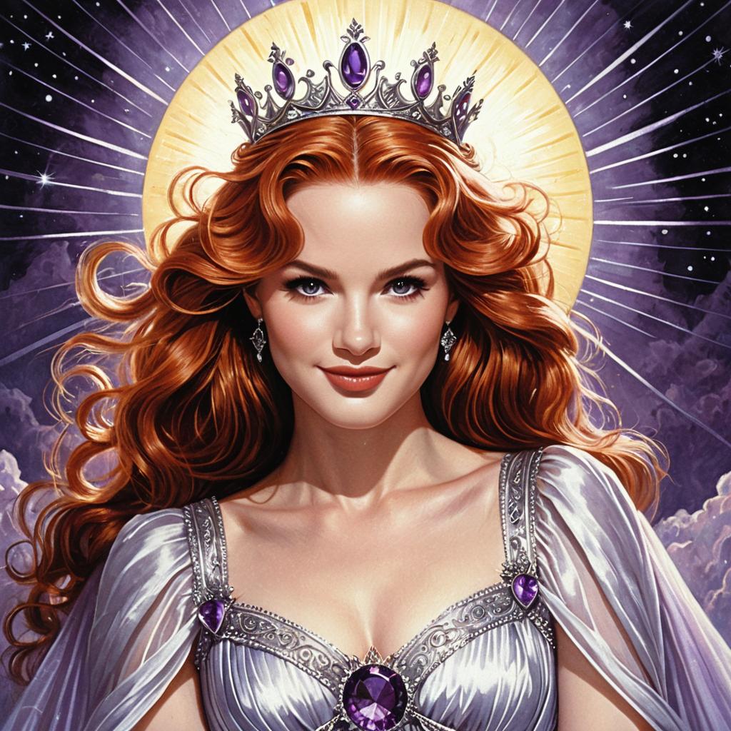 Transparent realistic vintage 90’s romance illustration portrait of a smirking ethereal, sassy, beautiful fae queen with long silver hair, turquoise and gold eyes in a green dress and majestic crown, front-facing with blowing hair, in the style of fantasy artist, Darrell K. Sweet
