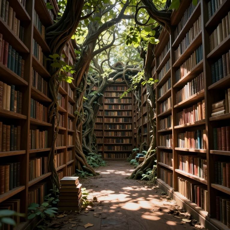 Photograph of a sunlit, enchanted library aisle with towering, vine-covered bookshelves, stacks of books on the floor, and dappled