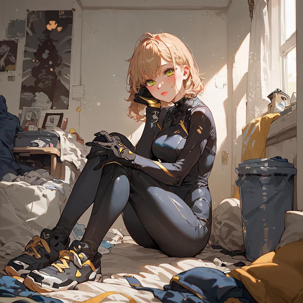 Score_9, score_8, score_7, source_anime, rating_general, yellow eyes, bodysuit, gloves, 1girl, solo, sitting, caught, messy room, bedroom, poster, trash can, computer, looking at viewer, embarrassed