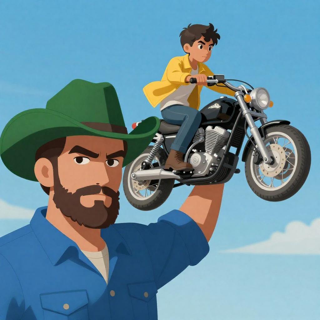 Photograph of four plastic figurines with exaggerated features. Central figure with large curly hair, green and black striped shirt. Two figures on left and right with spiky hair, one with mustache. Background: moonlit night sky, clouds. Figurines' intense expressions, standing closely.