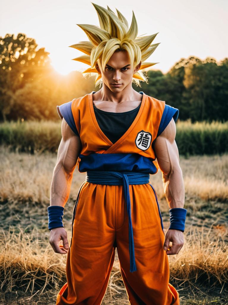 Man in Goku Super Saiyan Costume, photorealistic outdoor portrait, golden hour