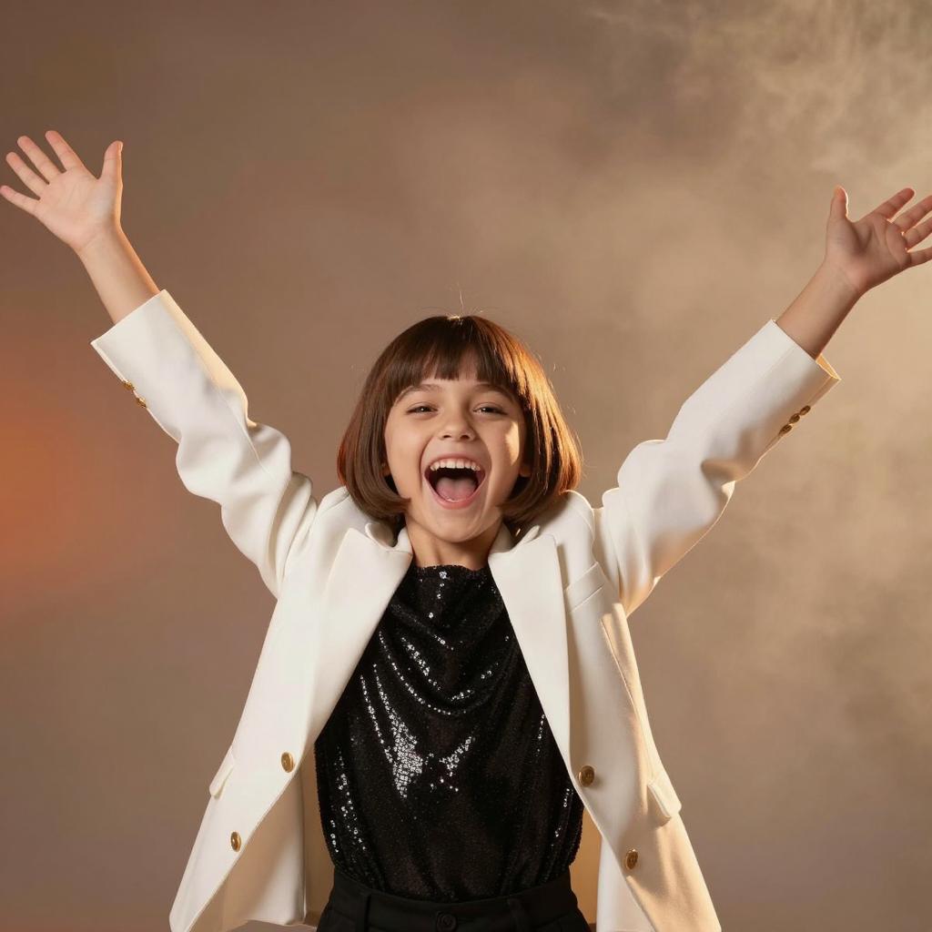 Child with brown bob haircut, wearing a white blazer and black sequined shirt, raises both arms with a joyful expression. Warm orange and yellow background with smoke. Mid-action shot, front view. Child centered, arms outstretched.
