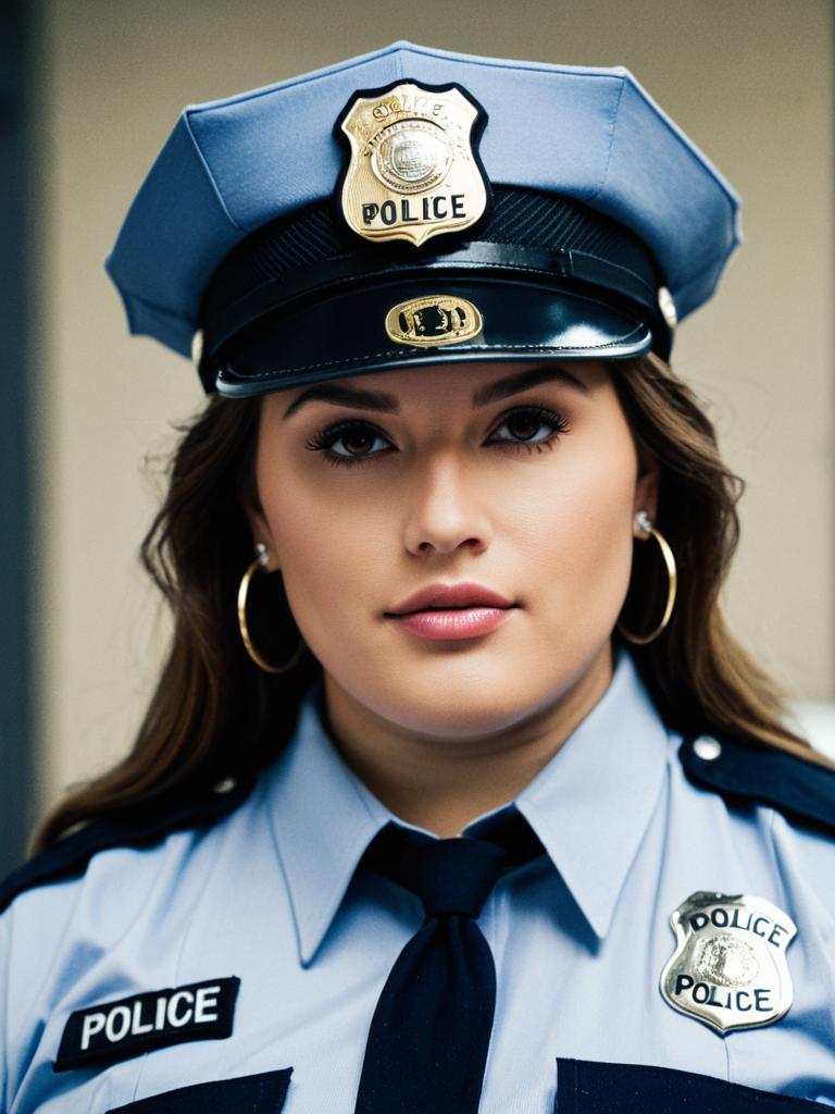 Close-up portrait of a plus size woman wearing a police uniform, including a police hat and badges. She has long brown hair, hoop earrings, and a confident expression, looking directly at the camera against a blurred background.