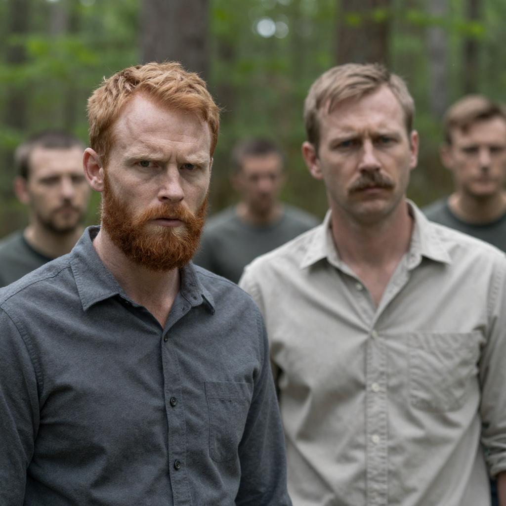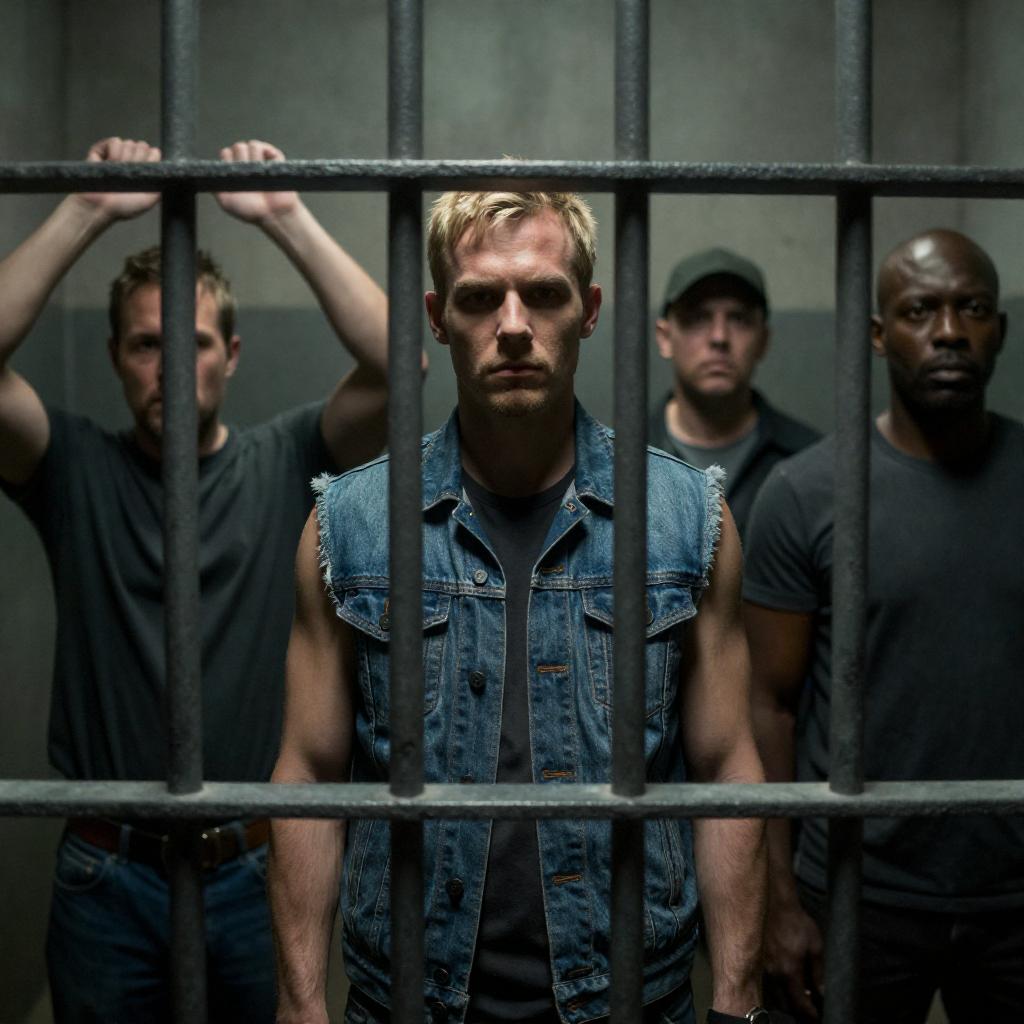 Four men in dim, green-tinted prison cell. Central man with short blonde hair, sleeveless denim vest, shadowed face. Man on left, arms raised, partially obscured. Man on right, wearing cap, dark shirt, intense expression. Man far right, shadowed, wearing dark shirt. Metal bars in foreground. Concrete wall background.