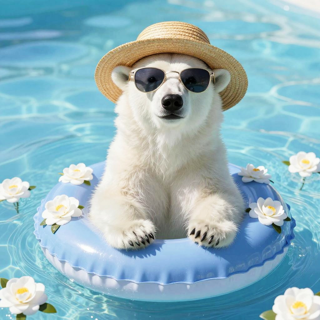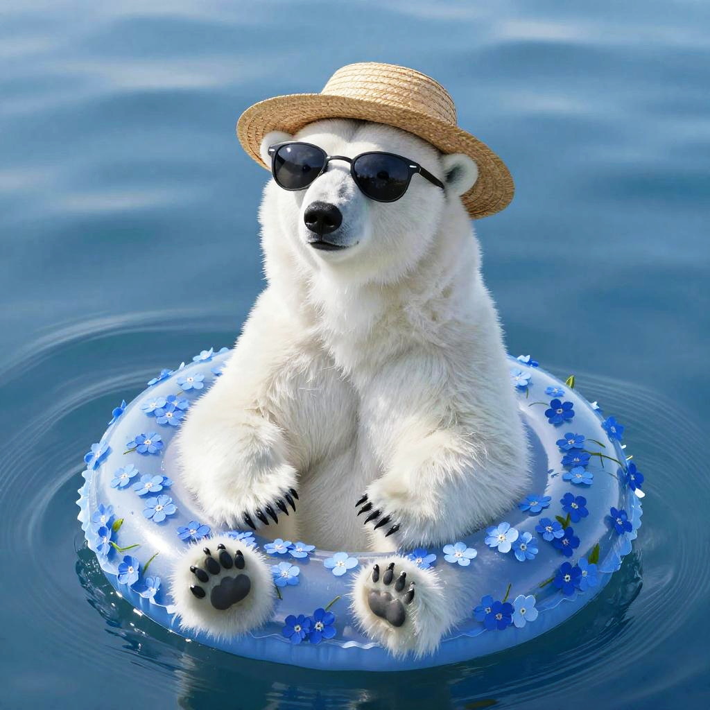 Full body, solo bear, animal focus, sitting bear, chubby cuddly teddy bear with sparkling bright eyes, straw hat, sunglasses, swim ring, cheerful multi-colored daisies, hugging the swim ring contentedly, blue background
