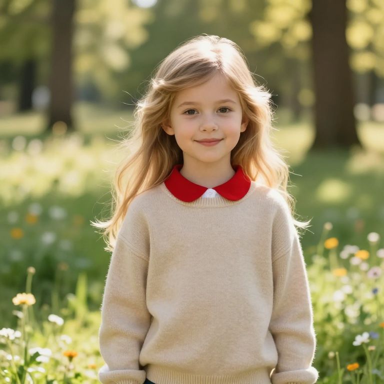 A beautiful young girl with soft, flowing blonde hair that gently cascades down her back, glowing subtly in the sunlight, wearing a cozy beige jumper over a crisp white shirt with a bold red collar that stands out against the neutral tones. She stands in a sunny, warm outdoor setting—dappled sunlight filters through the leaves of a quiet forest clearing, casting gentle patterns on the grass beneath her feet. Her smile is gentle and serene, radiating warmth and innocence, with soft, natural light highlighting her features and the texture of her clothes. The background features a mix of blooming wildflowers and a few tall trees, creating a peaceful, cheerful atmosphere that feels both inviting and timeless.