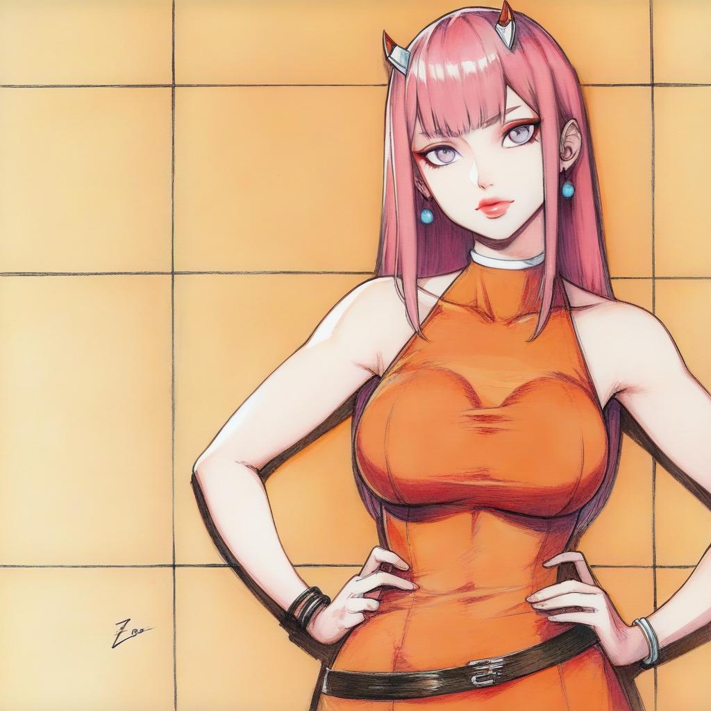 1girl, Zero Two, jewelry, dress, hands on own hips, long hair, breasts, earrings, bracelet, traditional media, signature, belt, bare shoulders, large breasts, looking at viewer, sleeveless, orange dress, lipstick, halterneck, makeup, taut clothes, tiles, against wall