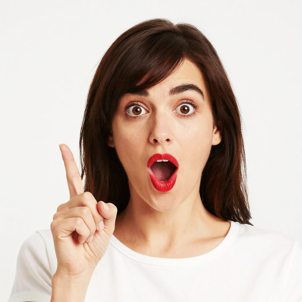 Photograph of a surprised woman with fair skin and dark brown, shoulder-length hair. She has wide, brown eyes, and her mouth is open in an "O" shape, revealing red lips. She is wearing a plain white shirt and is pointing upwards with her right index finger. The background is completely white, making her the sole focus. Her expression and gesture suggest surprise or realization. The image has a high-contrast, bright aesthetic, emphasizing her facial features and the simplicity of the background.