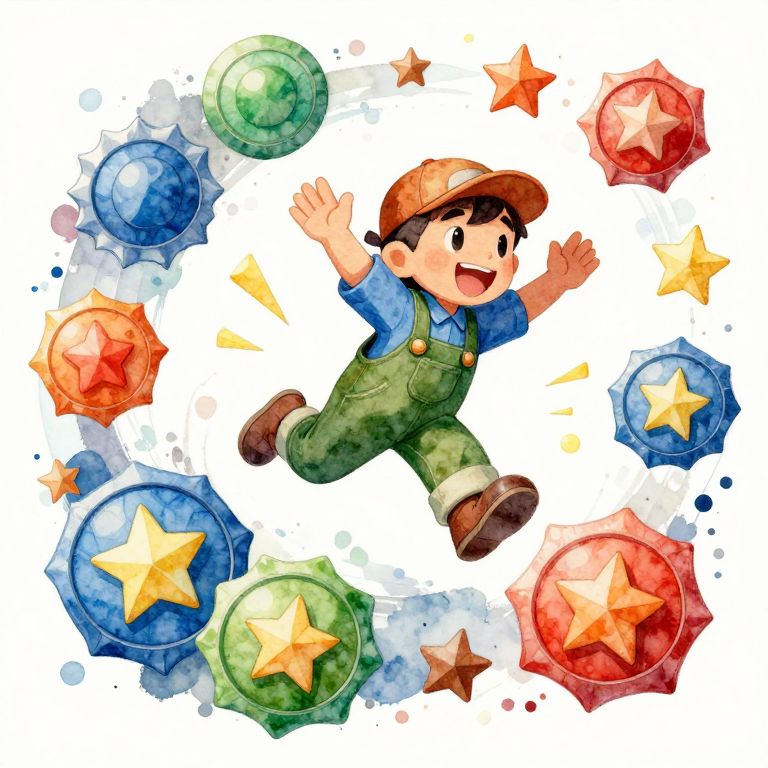 The image is a vibrant watercolor illustration featuring a dynamic scene of a game character in mid-air, leaping across a series of colorful badges, stars, and points. The character, dressed in a blue shirt, green overalls, and a brown cap, is depicted with a joyful expression, arms raised and legs bent, suggesting a sense of excitement and movement. Surrounding the character are various badges in shades of blue, green, and red, scattered across the scene, adding a playful and whimsical atmosphere. Interspersed among the badges are stars in hues of orange, yellow, and brown, each varying in size and shape, contributing to the lively and energetic feel of the artwork. The background is a mix of dark and light shades, with splashes of paint and ink, creating a sense of depth and dynamism. The overall composition is balanced, with the character centrally positioned, drawing the viewer's eye through the colorful elements, creating a sense of motion and adventure.