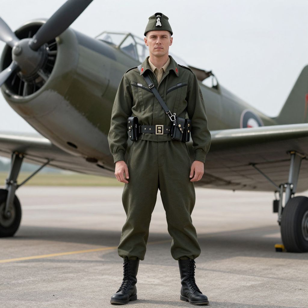 Photograph of a tall, muscular Caucasian male military pilot standing in front of a vintage, dark green military aircraft with a propeller. He wears a green flight suit with multiple black utility belts, black boots, and a matching flight cap. His expression is neutral, and he stands with his hands by his sides on a paved runway. The aircraft's nose is on the left side of the image, and the background is slightly blurred, highlighting the subject and the plane. The lighting is natural, and the overall atmosphere is formal and professional.