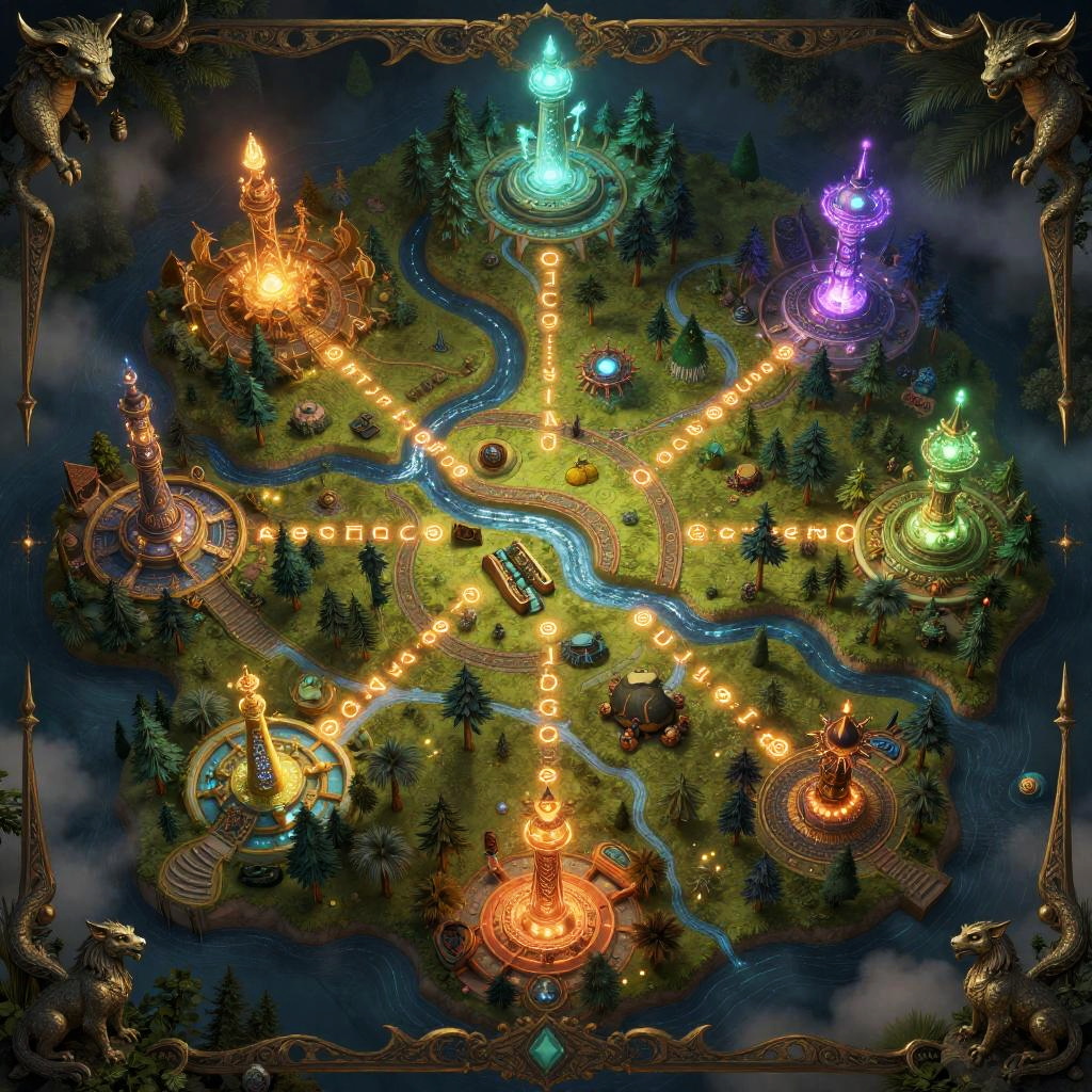 Fantasy island map, digitally illustrated with glowing magical landmarks, enchanted towers, serpentine rivers, and fairy-tale forests, glowing runes marking secret paths, ornate borders with mythical beasts, rich jewel-toned palette, atmospheric mist overlay.
