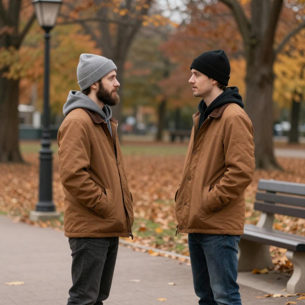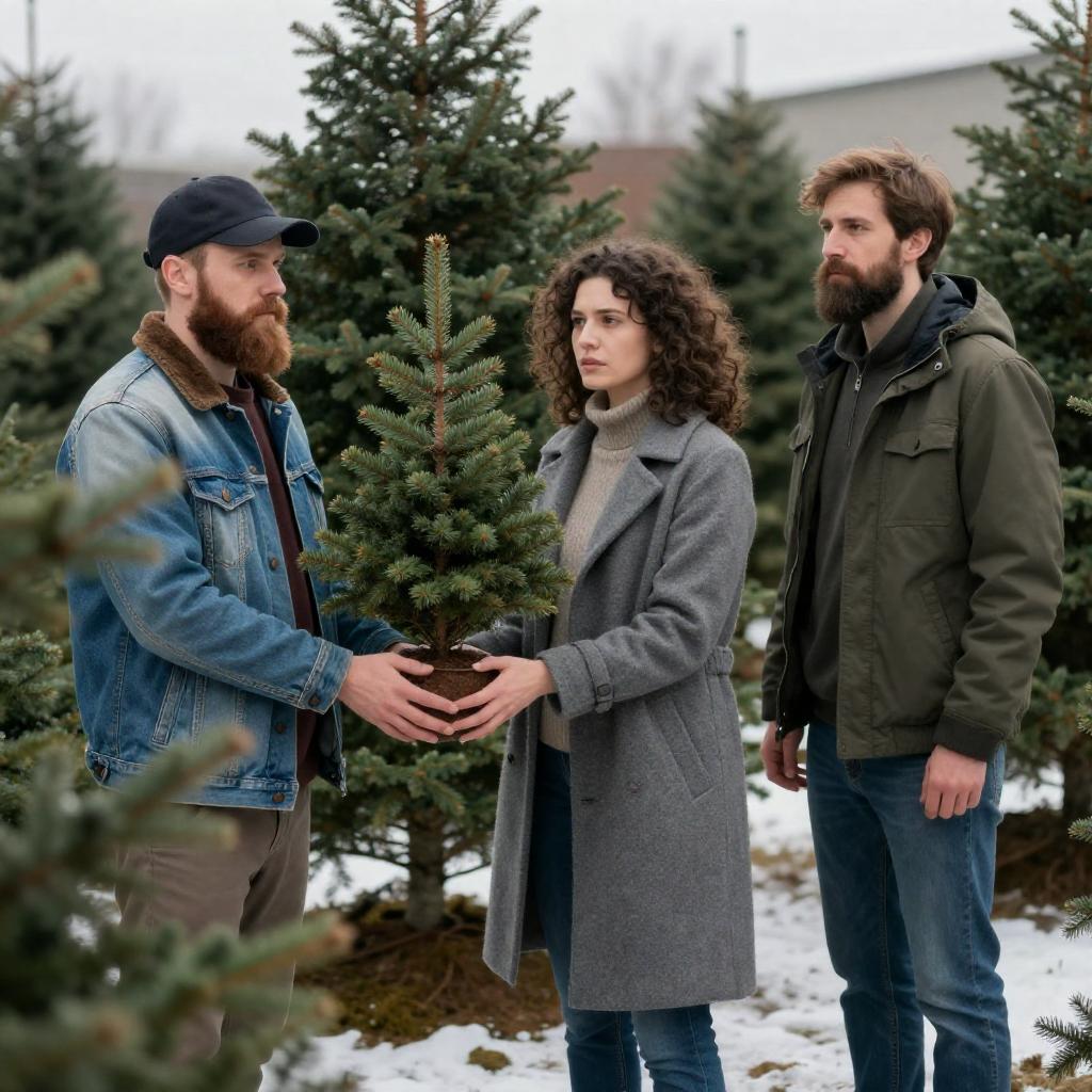 Three people standing among Christmas trees. A bearded man in a denim jacket and cap, a woman with curly hair in a gray coat, and another bearded man in a green jacket. The woman receives a small tree from the first man, while the second man watches. Snow on the ground. Green pine trees in the background. Intense expressions.