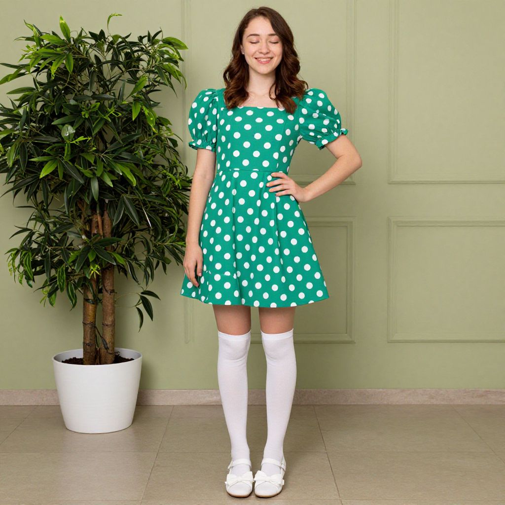 Photograph of a young woman with fair skin, dark brown hair in a bun, wearing a white polka dot dress with black bow, black belt