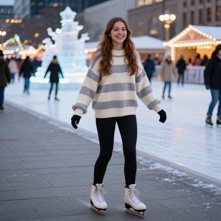 A fun and casual ice skating outfit featuring a striped gray and cream sweater, black leggings, and snow boots, worn by a cheerful teenage girl with long brown hair and a bright smile, standing on a city sidewalk during a winter festival with bright lights and ice sculptures in the background