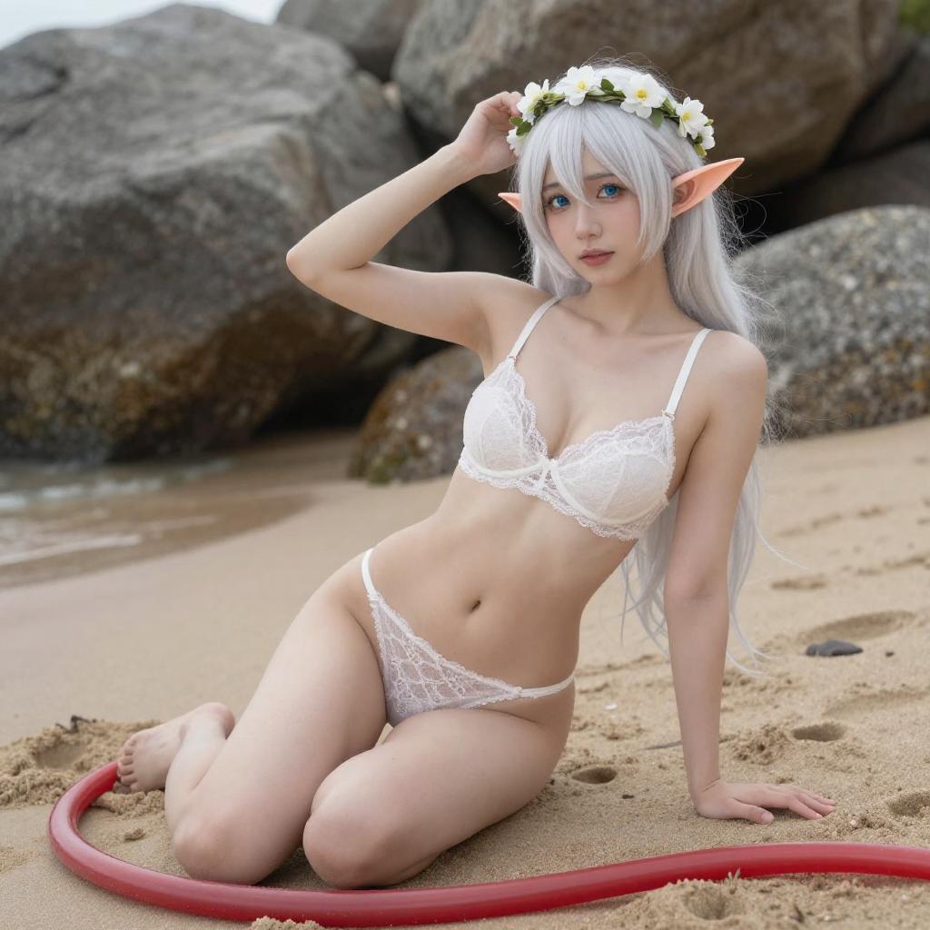Photograph of a white-haired, elf-like woman with pointed ears, wearing white lace lingerie and thigh-high stockings, sitting on a gravel path. She has pale skin, red lipstick, and a blue flower crown. Her right arm is raised, and her left hand rests on her thigh. Large rocks and grass are in the background.