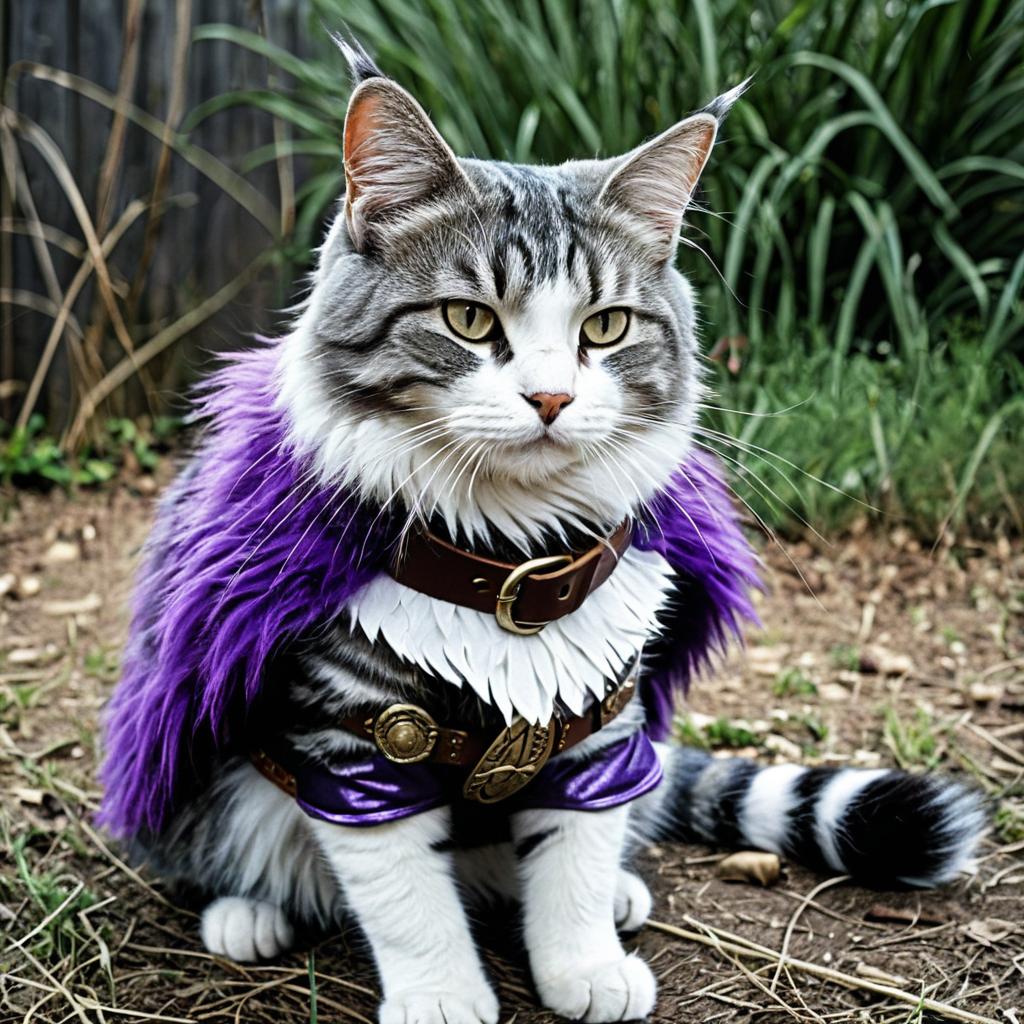 Big the Cat, cosplay costume realistic gray and white tabby cat with purple fur, fantasy warrior outfit with brown belt