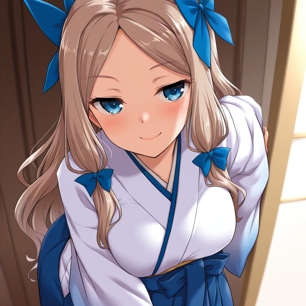 Asakaze (kancolle), kantai collection, 1girl, blue eyes, long hair, wavy hair, light brown hair, brown hair, parted bangs, sidelocks, hair bow, meiji schoolgirl uniform, meiji schoolgirl uniform, hakama skirt, blue bow, forehead, blue hakama, by artist yoshi tama, illustrious