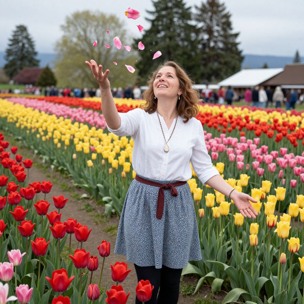 Photograph of a smiling Caucasian woman with wavy brown hair, wearing a white knit sweater and blue jeans, joyfully tossing pink tulip petals in a vibrant flower field. The field is filled with red, yellow, and pink tulips, with blurred people and tents in the background. The overcast sky and distant trees create a serene outdoor setting. The woman's expressive gesture and bright colors contrast with the green stems and leaves of the tulips, capturing a moment of carefree happiness.