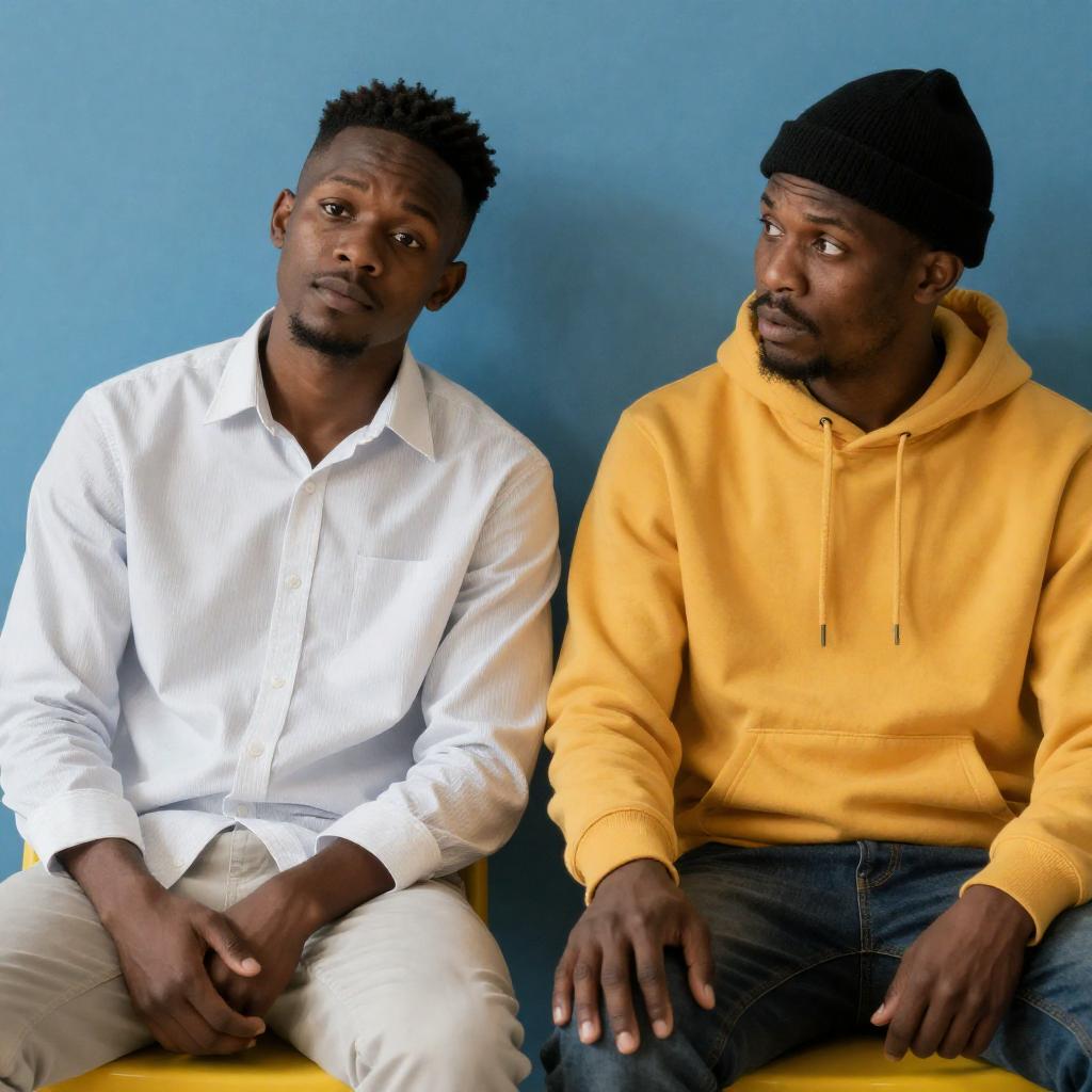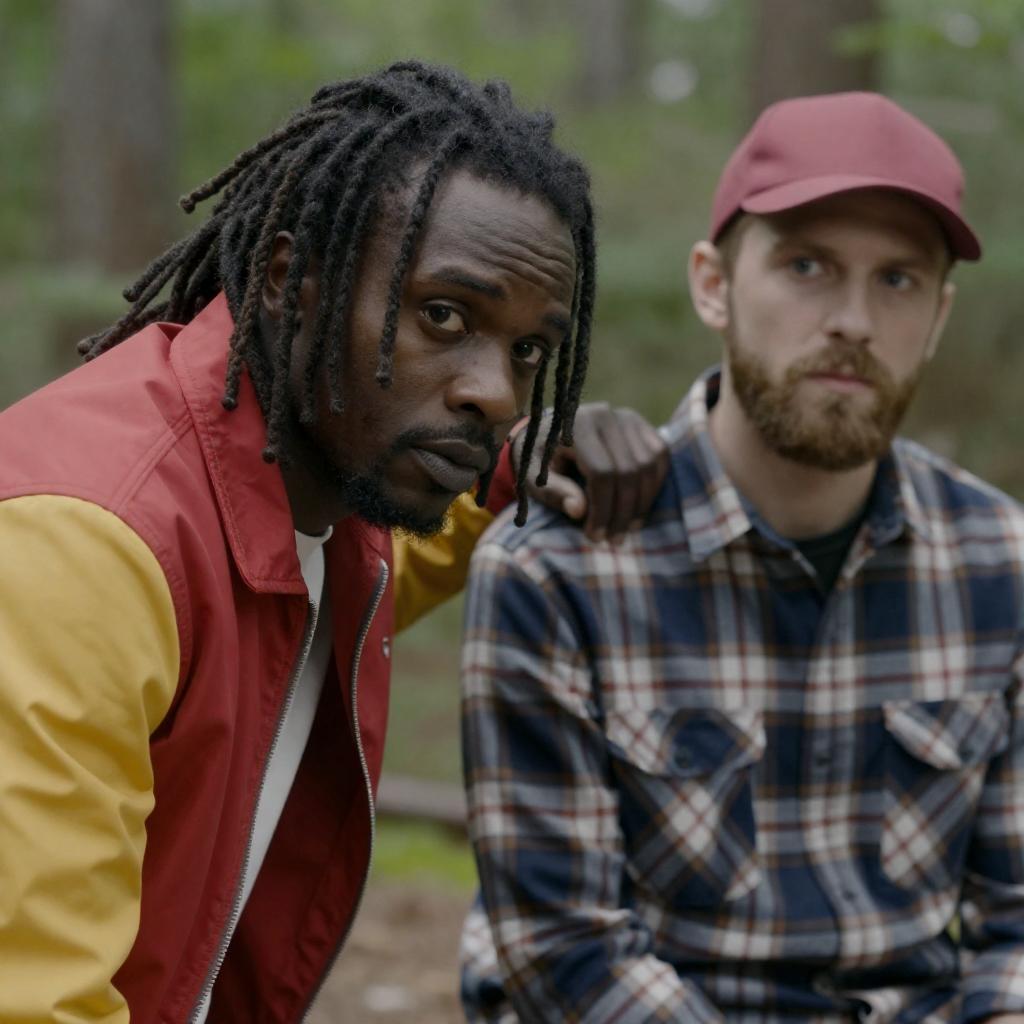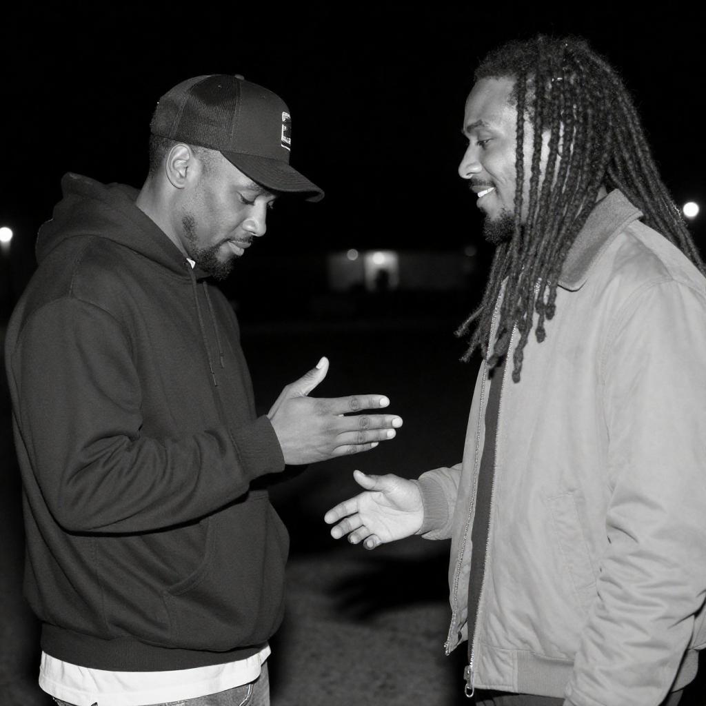 Black-and-white photograph of two men interacting outdoors at night. The man on the left, wearing a dark hoodie and backward cap, gestures with his hands while looking down. The man on the right, with long dreadlocks and a light jacket, smiles and extends his hand. Both are focused on each other, creating a sense of connection.