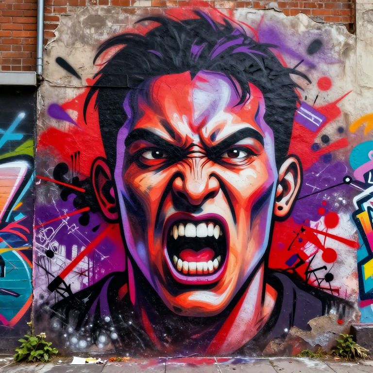 Livid urban street art mural featuring a face contorted in fury, vibrant graffiti splashes of red, purple, and black, chaotic energetic lines and textures capturing raw emotion, set against a decaying brick wall in an edgy contemporary style.