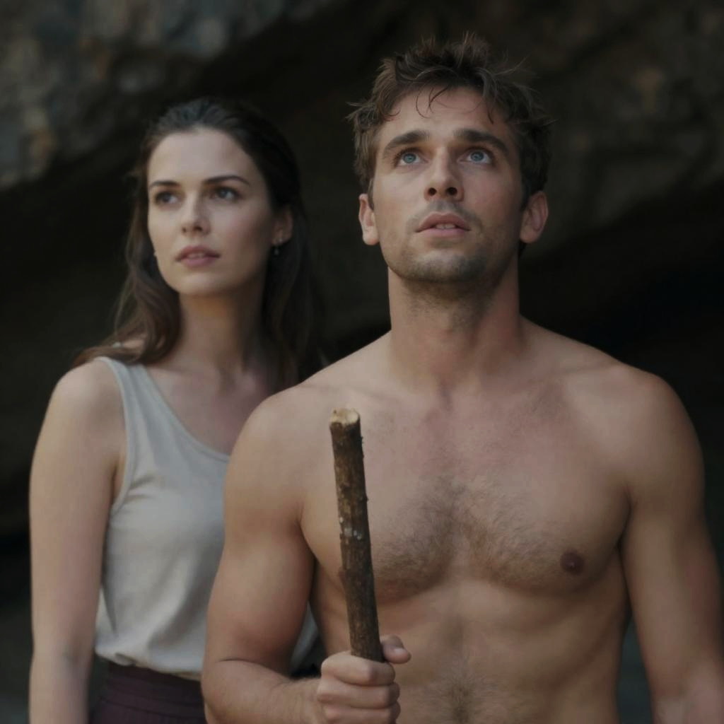 Shirtless man with chest hair, holding a stick, looking up. Brown-haired woman in a sleeveless top, looking to the side. Dark rocky cave background. Both standing close together. Film still. Man's expression is curious, woman's expression is thoughtful.