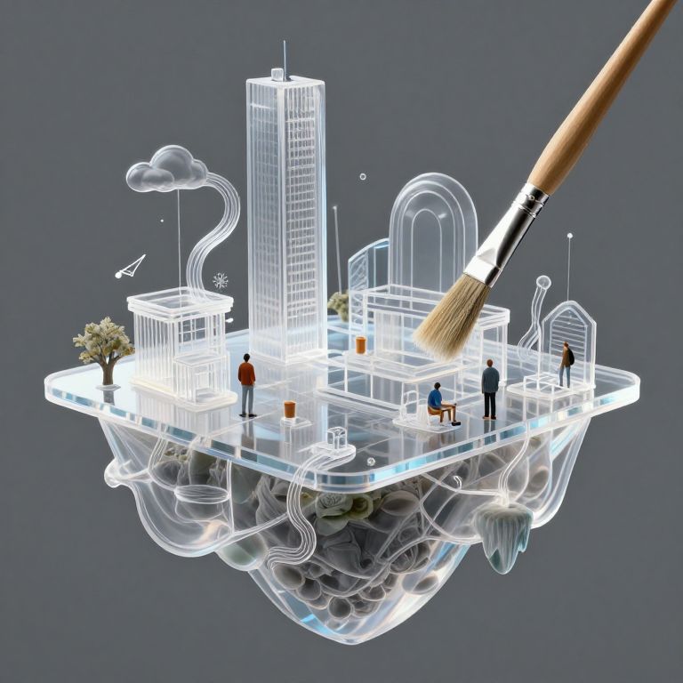 Digital illustration of a floating, transparent cityscape with white, wireframe buildings including a tall skyscraper and smaller structures. Six small, colorful human figures stand and sit on the glass-like surface. A large paintbrush with a wooden handle and metal bristles hovers above, as if painting the scene. The background is a solid, dark gray. The city features a tree on the left, a cloud, and curved lines suggesting futuristic architecture. The overall style is surreal and modern, blending elements of city planning and digital art.