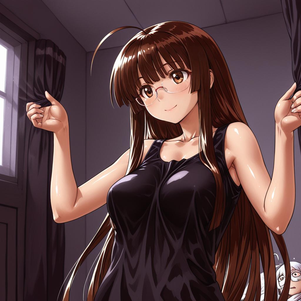 Digital illustration of an anime girl with long brown hair, brown eyes, wearing glasses, and a black sleeveless top. The character has a distinctive ahoge hair strand and is standing indoors near a window with curtains. The style is detailed and glossy, reflecting the art style inspired by Haraya Manawari.