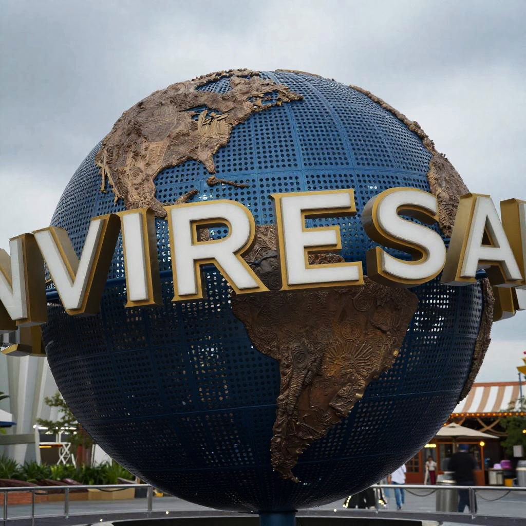 Close-up of Universal Studios Japan globe, detailed metal panels with weathered texture, dramatic lighting highlighting engraved letters, background shows famous park attractions under cloudy sky, photorealistic style, moody and epic atmosphere