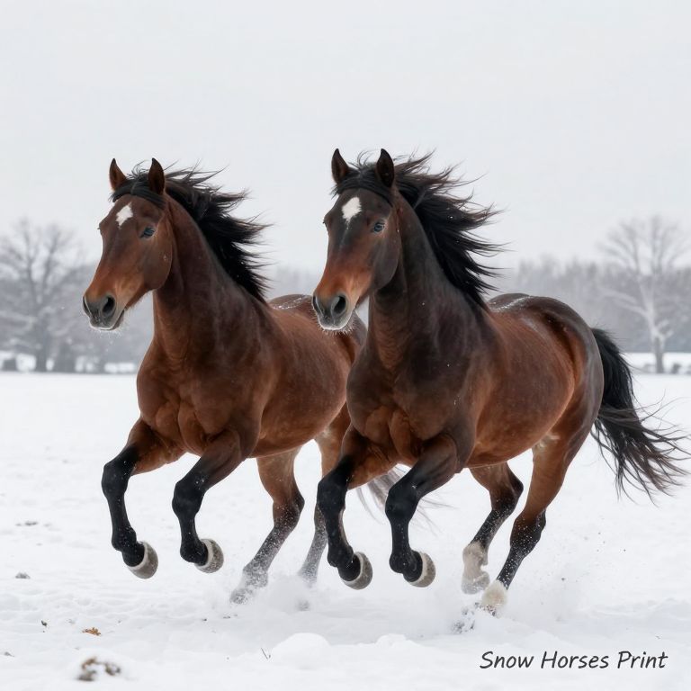 Two majestic horses gallop side by side across a snowy landscape, their dark manes flowing in the wind, captured in a serene and dynamic scene titled \"Snow Horses Print\" by Mary Armstrong.